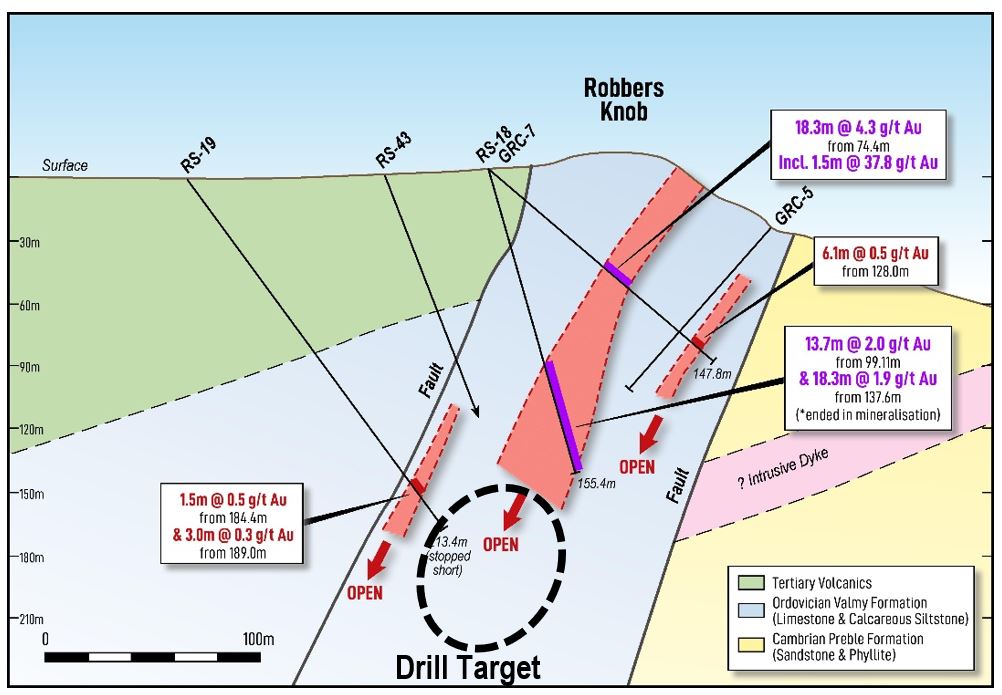 Figure 3: Cross Section at Robbers Knob illustrating example of drill-ready target defined in dash-black circle.
