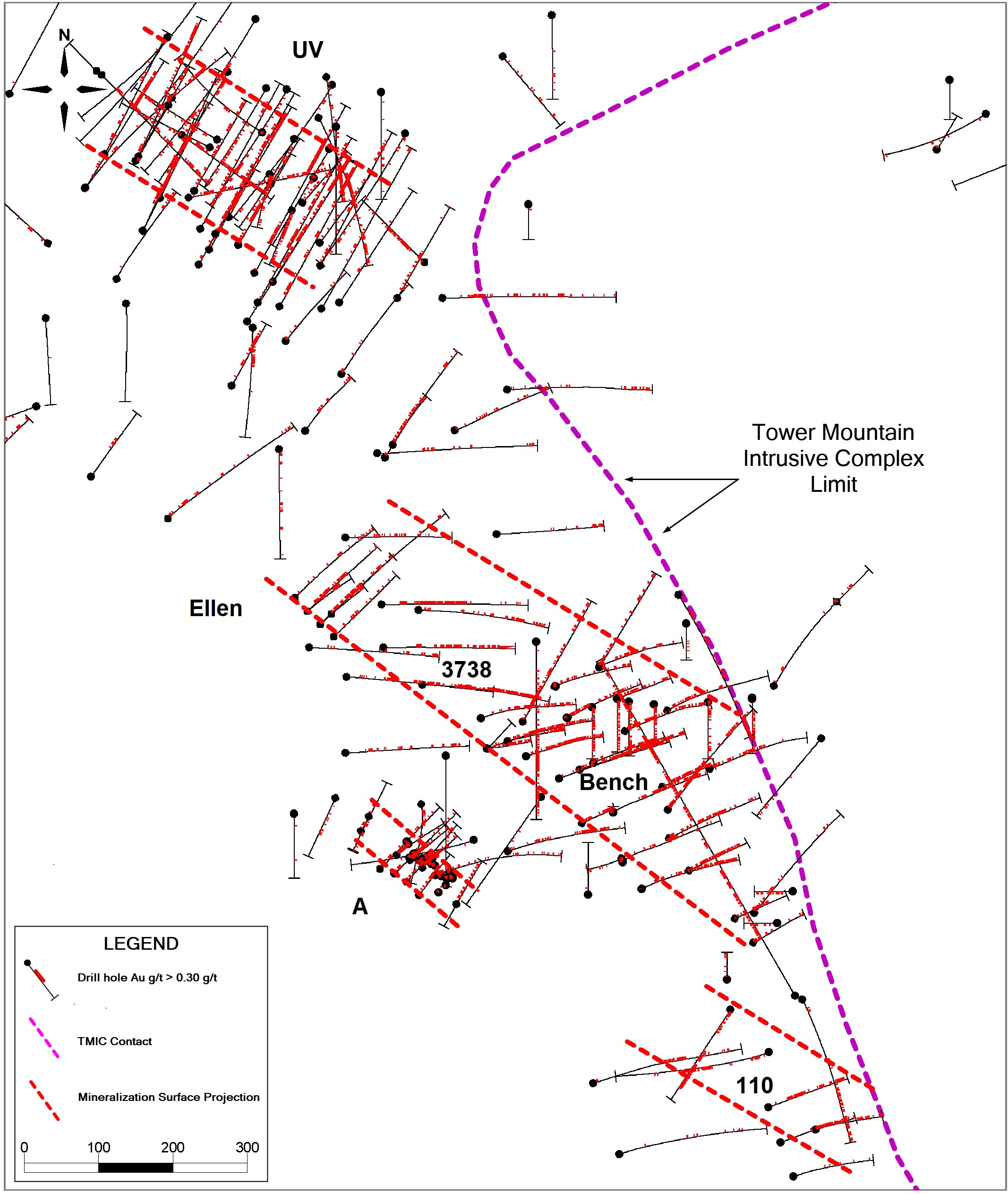 The MRE shall evaluate the UV, Bench, Ellen, A, 110 and 3738 targets, arrayed along the western contact of the Tower Mountain Intrusive Complex ("TMIC") over a total strike length of 1,800 metres representing