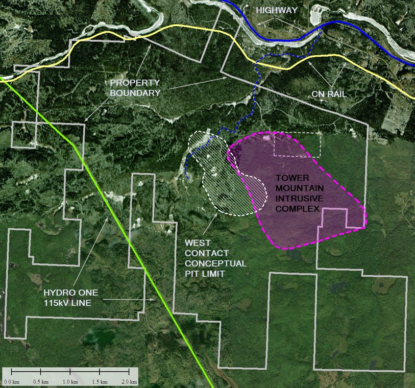 The Tower Mountain Property is located 40 kilometres west of the port city of Thunder Bay, ON. The Trans-Canada highway provides year-round access to the property via a 4.0 kilometre secondary road. The main east-west CN rail line, with an existing siding, crosses the secondary road accessing the property. The existing main hydro transmission line is located 2.0 kilometres west of the conceptual pit limit. The Company's conceptual pit limit is currently 2.0 kilometres south of the Matawin River and Trans-Canada highway and 1.5 kilometres from the CN rail line.