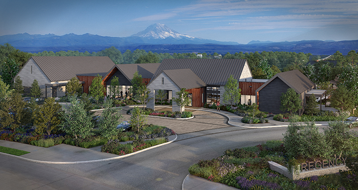 An impressive selection of first-class amenities will provide Regency at Ten Trails residents with ample opportunities for recreation and social connection, including an expansive 10,000-square-foot resort-style clubhouse and fitness center inspired by the views to Mount Rainier, featuring an indoor pool, bocce ball and pickleball courts. Designed as a backdrop to an active lifestyle and the social hub of the community, residents have opportunities to utilize the spaces for small, casual gatherings or more formal community events. The great hall, club lounge, and indoor pool offer an indoor/outdoor experience with large glass doors and windows. A dedicated onsite lifestyle director will plan year-round programs, events, social gatherings, and services. Residents will enjoy an 11,000-square-foot dog park with a washing station, sheltered areas with fireplaces, and paths that connect to the master plan.