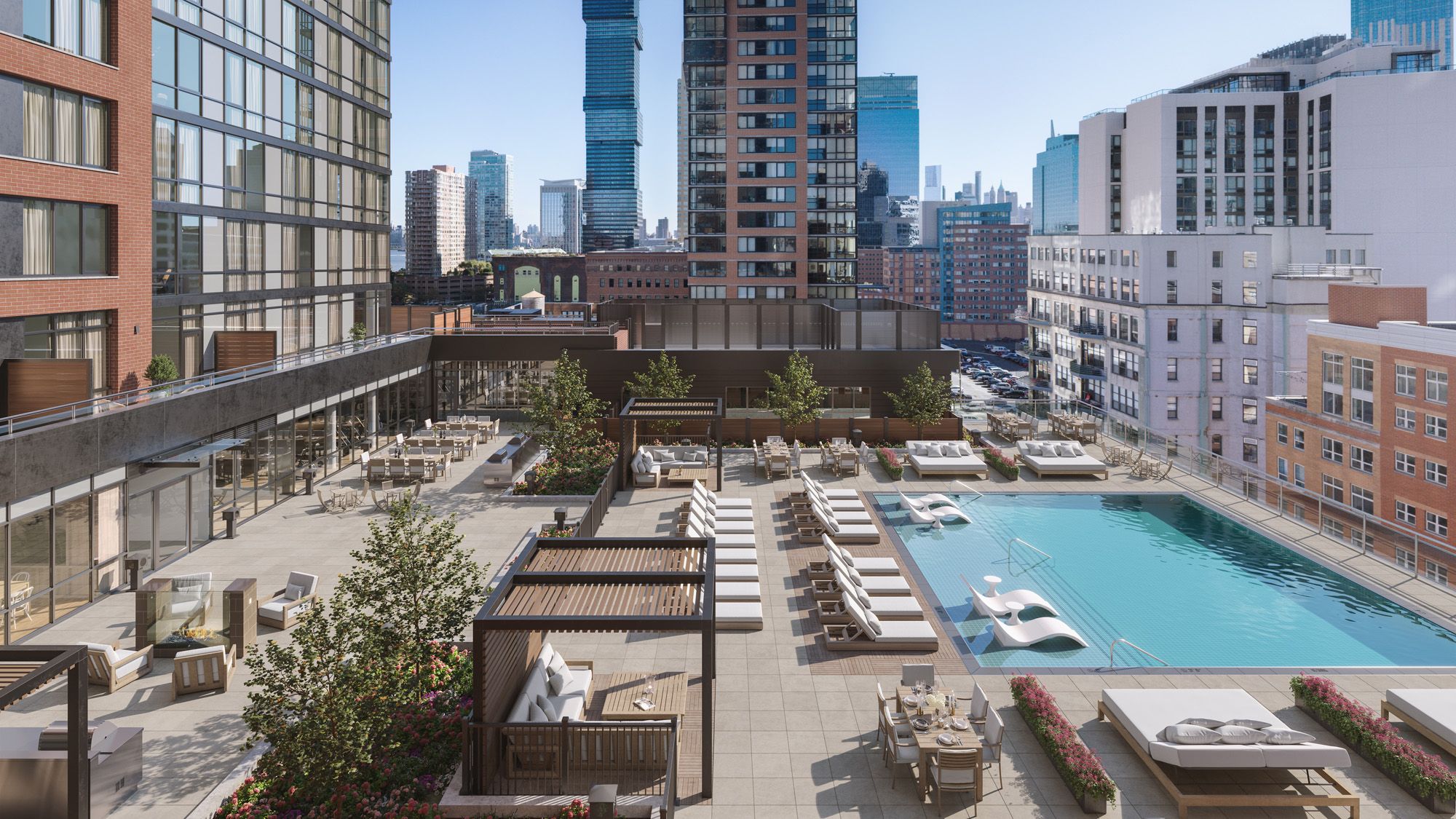 The 8th floor houses the fitness center with yoga room and an expansive residents’ lounge with a kitchen that opens out onto a sprawling sundeck with a gas fire pit and grills, seating for dining and a pool with chaise lounges. Residents will enjoy the lounge’s kitchen, fully outfitted with professional quality appliances, along with a dining room and media lounge. Additional amenities include a game lounge with skee-ball and arcade games, children’s playroom, dog run and spa, onsite parking and a 24-hour attended lobby to greet guests and take deliveries.