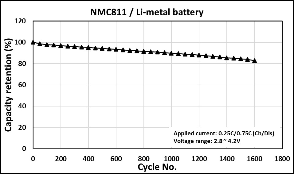 - 1600 cycles at 0.75C for a lithium-metal pouch cell