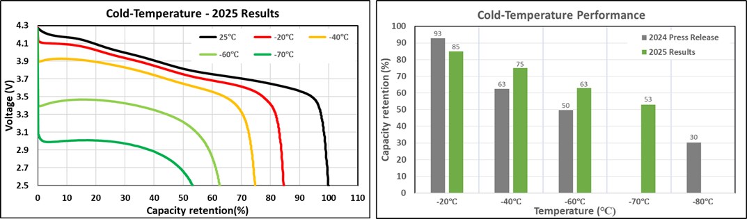 The right panel compares the 2025 results with the data disclosed in the Company's September 16, 2024, press release, showing clear gains at -40°C, -60°C, and -70°C, along with continued operation in temperature ranges where most lithium-ion architectures cease to function. Very few chemistries operate reliably below -40°C, and the combined panels highlight meaningful gains in extreme-cold stability, improved low-temperature discharge behaviour, and a clear advancement over the Company's previously reported performance.