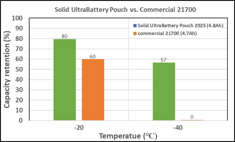 In a separate evaluation using a different cell format, Volt Carbon also completed a comparative low-temperature test of its Solid UltraBattery pouch cell against a commercially available 21700 lithium-ion cell. As shown in Figure 4, the Solid UltraBattery pouch cell continues delivering usable performance at -20°C and -40°C, while the commercial 21700 cell shows a rapid decline at -20°C and complete failure at -40°C.