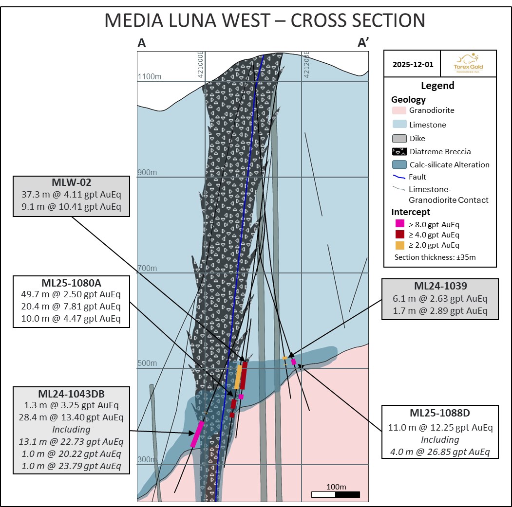 Toronto, Ontario--(Newsfile Corp. - December 1, 2025) - Torex Gold Resources Inc. (the "Company" or "Torex") (TSX: TXG) (OTCQX: TORXF) is pleased to provide results from the 2025 drilling program at Media Luna West, which support the Company's strategy to target near-mine opportunities in the Media Luna Cluster in order to further enhance and extend the production profile of the Morelos Complex.