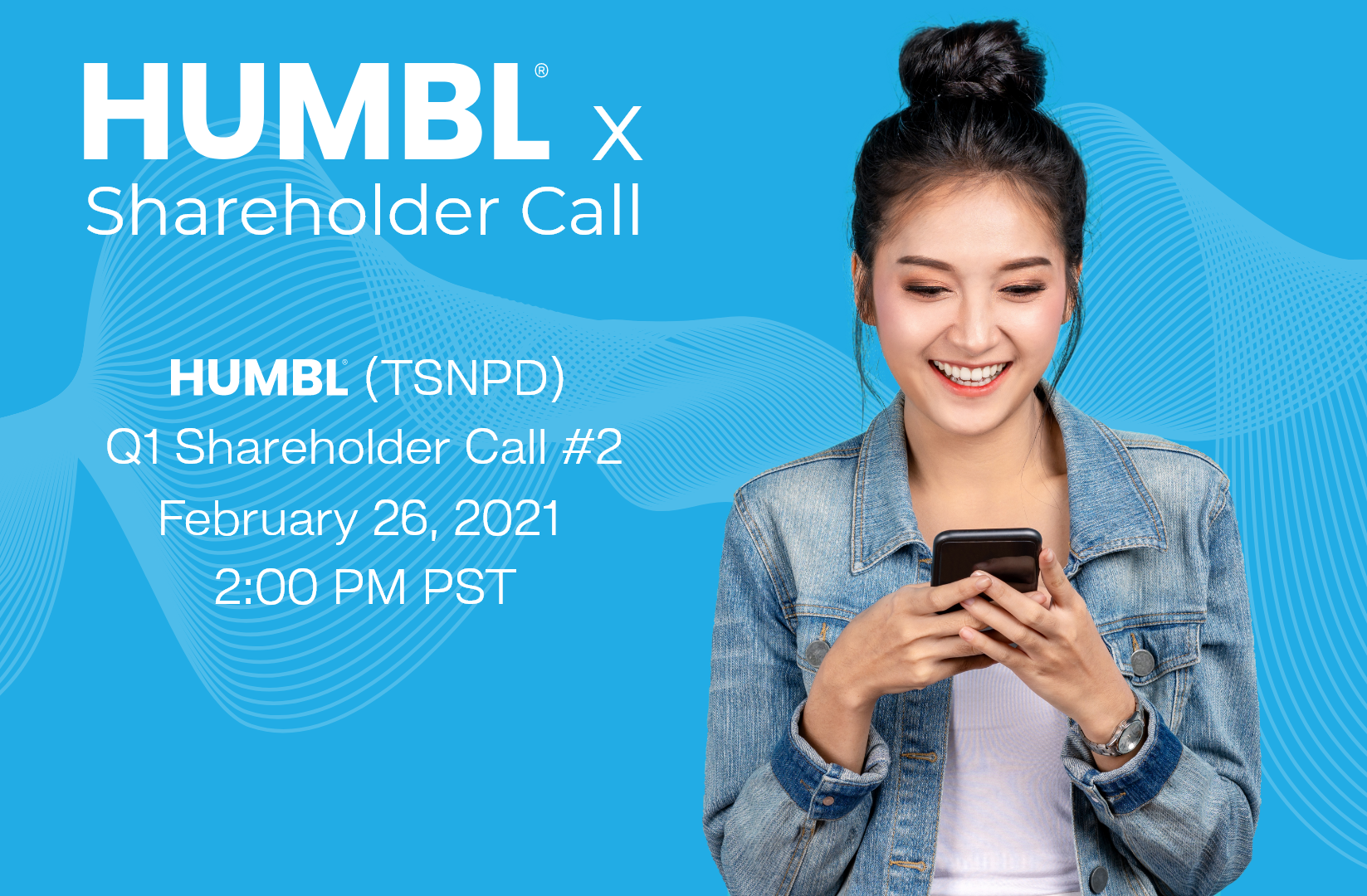 San Diego, CA, Feb. 26, 2021 (GLOBE NEWSWIRE) -- HUMBL, Inc. (OTCPINK: TSNPD) (“HUMBL”), announced today that it will host a “Zoom” shareholder conference call on February 26, 2021 at 5:00 p.m. EST.