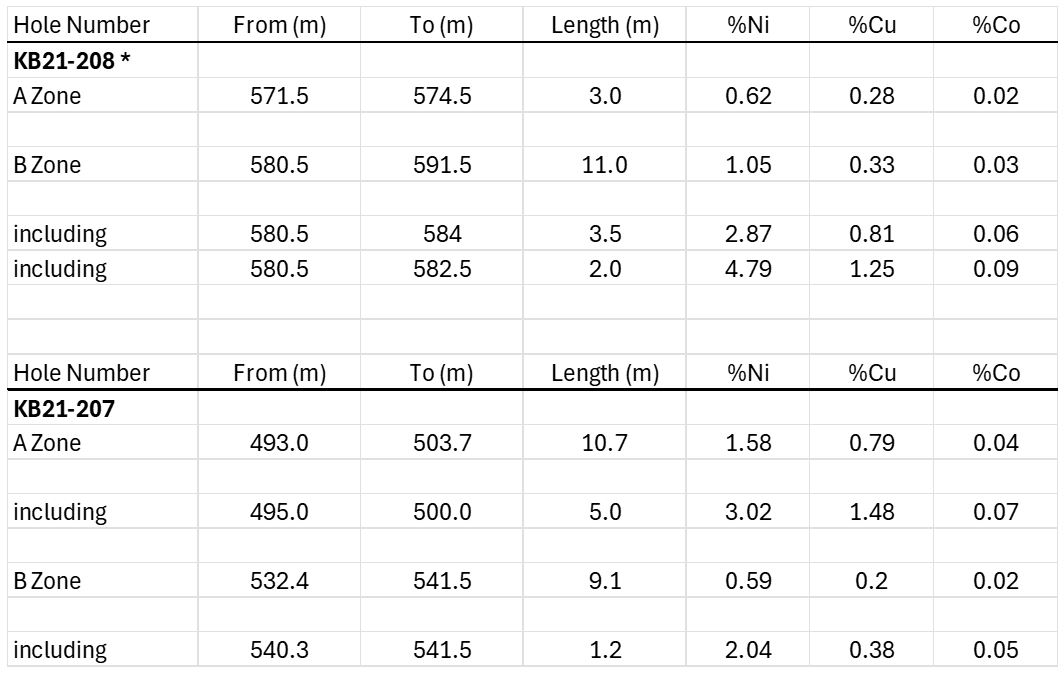 - Intercept of 11.0 m @ 1.05% Ni, 0.33% Cu in drill hole KB26-208