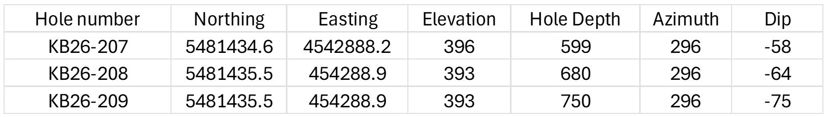 A total of 2,700m of drilling has been completed to date. The first 3 drill targets have been completed (drill holes KB26-207, KB26-208 and KB26-209 outlined on Figure 1). Samples have been delivered to AGAT Labs in Thunder Bay for analysis. Assays are pending for hole KB26-209. The drill rig is currently drilling the 4th drill hole KB26-210. This hole is designed to be drilled below the existing shaft bottom to test for the depth extension to the deposit.