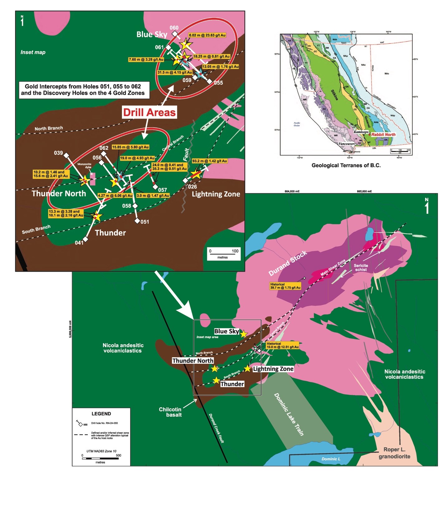 Approximately six holes are planned at Thunder North, where previous drilling (see Fig. 1) traced the gold zone 300 m eastward from discovery hole No. RN23-039 (25.7 m of 2.04 g/t Au; see Fig. 1) to the most recent and easterly hole, No. 062 (19.0 m of 4.93 g/t Au). The present holes are variously designed to trace the gold zone to depth, extend it further along strike — especially to the east as its grade appears to increase in this direction — and infill a 150-m gap resulting from the intersection of a large, unmineralized monzonite dyke within the gold-hosting Nicola tuff horizon in Hole RN23-040.