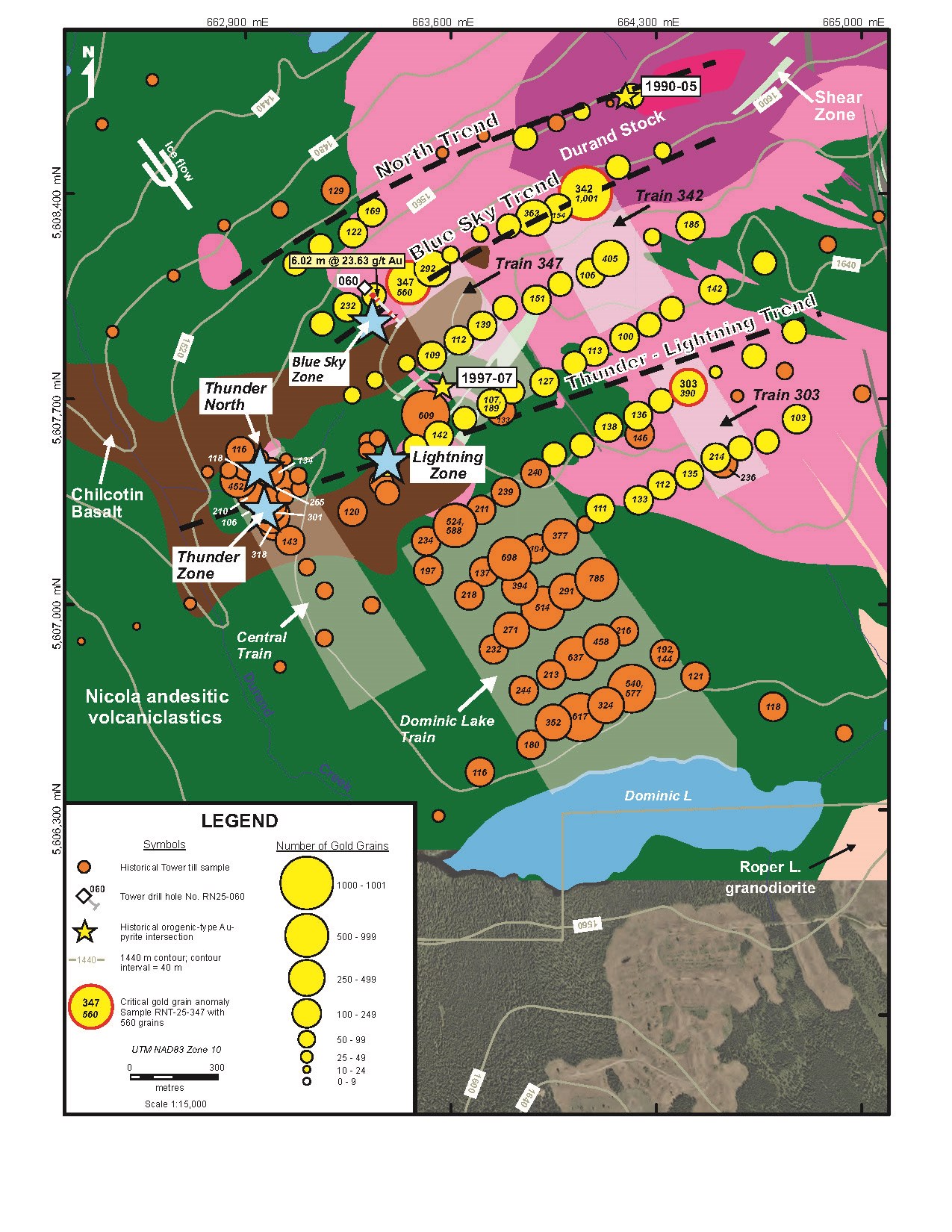 Six holes totaling 1756 m were drilled on the Blue Sky trend. The first three holes, Nos. RN25-063 to 065, were drilled at various angles near discovery hole No. RN24-055 (31.5 m of 4.15 g/t Au; see Fig. 1) to determine the orientation and overall prospectivity of the contact between the Durand diorite and Nicola tuff along which the Hole 055 mineralization occurs. The other three holes were designed to follow the Durand-hosted Hole 060 intersection (6.02 m of 23.63 g/t Au; see Fig. 1) both down-dip and 100 m eastward along the mineralized trend toward the strong, 560-grain anomaly obtained from the Company's recent till gold grain survey (see Fig. 2 and November 3, 2025 press release).