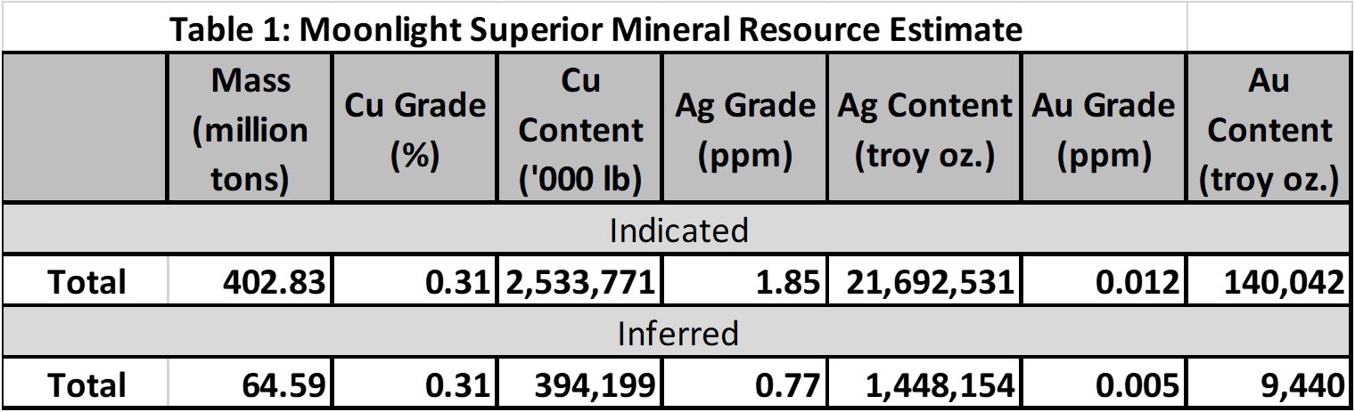 The new claims will increase the total land package at Moonlight Superior to 7,053 acres. These new claims are intended to provide the additional acreage necessary to support the anticipated development and operations plan for the Moonlight-Superior Copper Project, including plant infrastructure, water treatment and waste rock stockpiles.