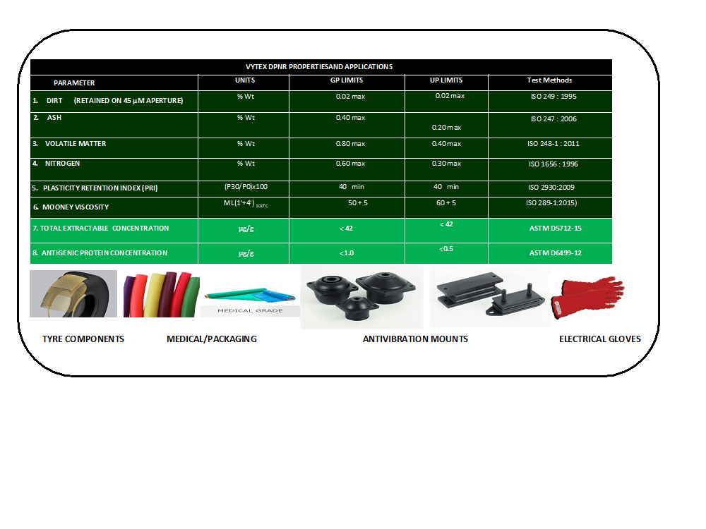- Dry rubber specialty grades which are DPNR based and compatible with silica to compete with solution styrene-butadiene rubber (SBR) in low rolling resistance/high wet grip tire formulations -- a natural equivalent to ethylene propylene diene monomer (EPDM),