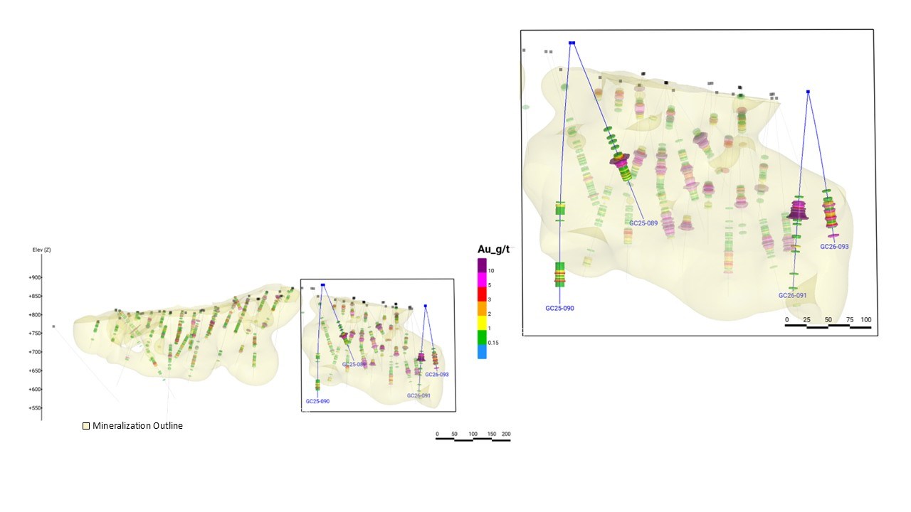 - Hole GC25-89 returned 32.0m of 4.48 g/t Au from 152.4m to 184.4m, about 30m south of GC25-48 (41.2m at 4.33 g/t Au) and about 100m below surface vein exposures.
